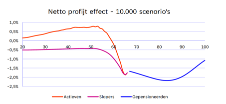De berekening van het netto-profijt in mei 2023 kwam uit op het volgende; mensen die al pensioen ontvangen kunnen een netto profijt hebben van maximaal -/- 2.3%. Mensen die nog pensioen opbouwen kunnen een netto profijt hebben van maximaal +/+ 0.8%, zij betalen immers nog premie voor hun pensioen.